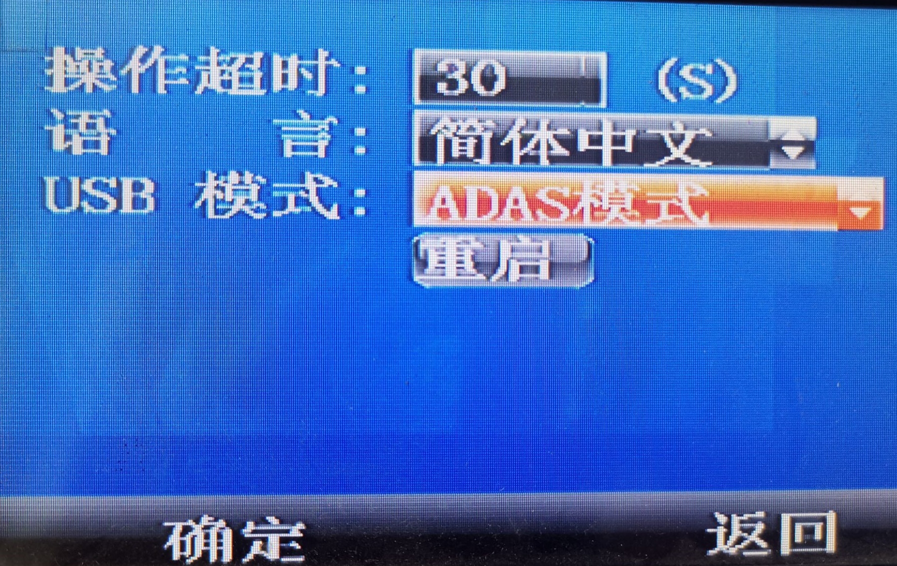 進入設置界面(遙控器按ENTER鍵 ,密碼999999)----工具---操作管理,將USB模式設置為ADAS模式,重啟