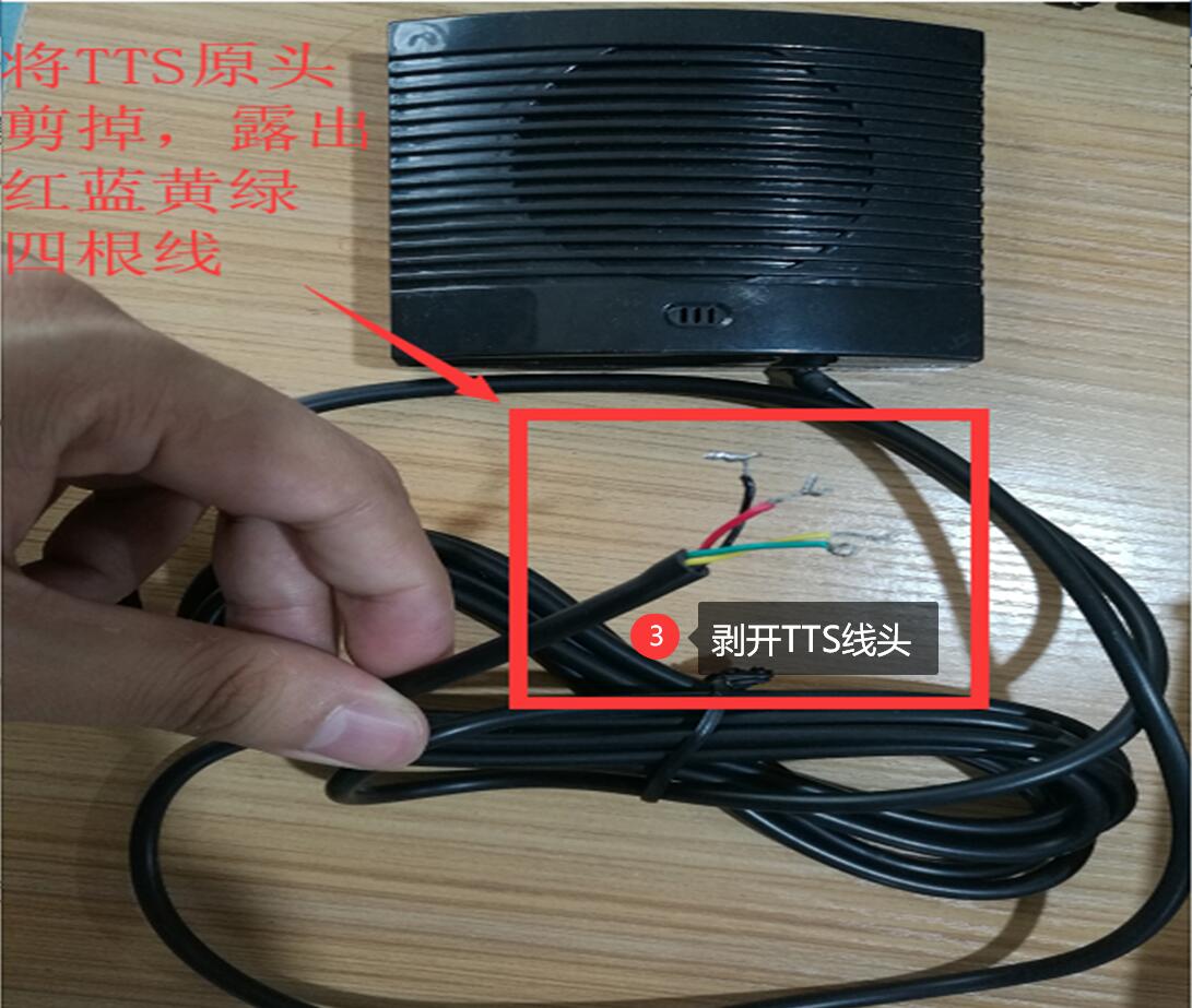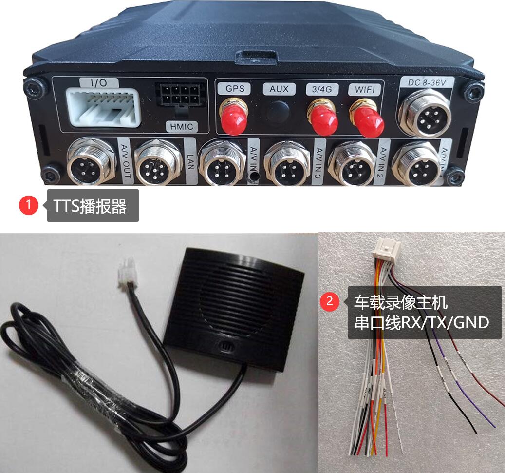 準(zhǔn)備好TTS語(yǔ)音播報(bào)器一套,M51H車載監(jiān)控主機(jī)一套,M51H主機(jī)的IO線一條