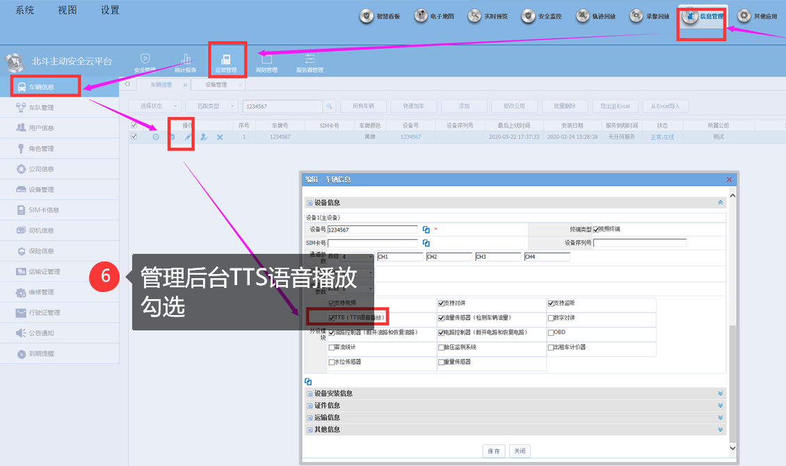 先進(jìn)入后臺(tái)管理頁(yè),“運(yùn)營(yíng)管理”---“車輛管理”項(xiàng)里---設(shè)備信息---“TTS語(yǔ)音播放”功能勾選