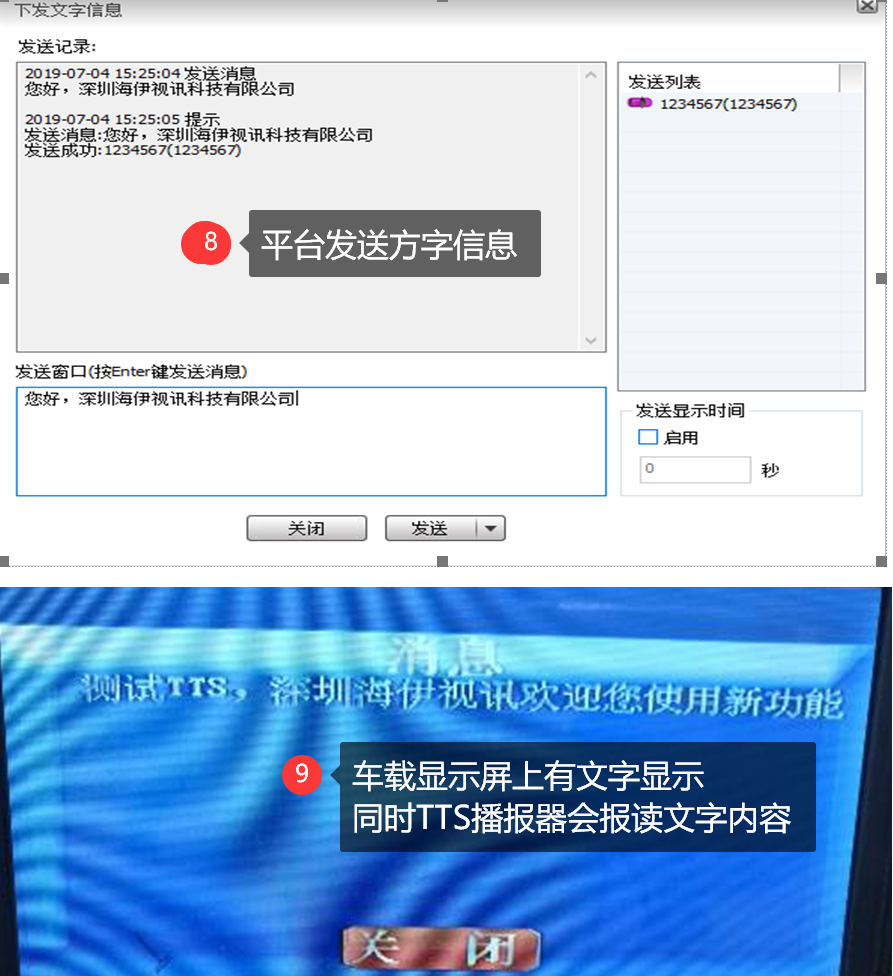 軟件會(huì)彈出下發(fā)文字信息界面,輸入需要下發(fā)的文字信息,點(diǎn)擊發(fā)送,設(shè)備端的TTS語(yǔ)音播報(bào)器就會(huì)播報(bào)下發(fā)文字,若有屏幕同時(shí)會(huì)顯示