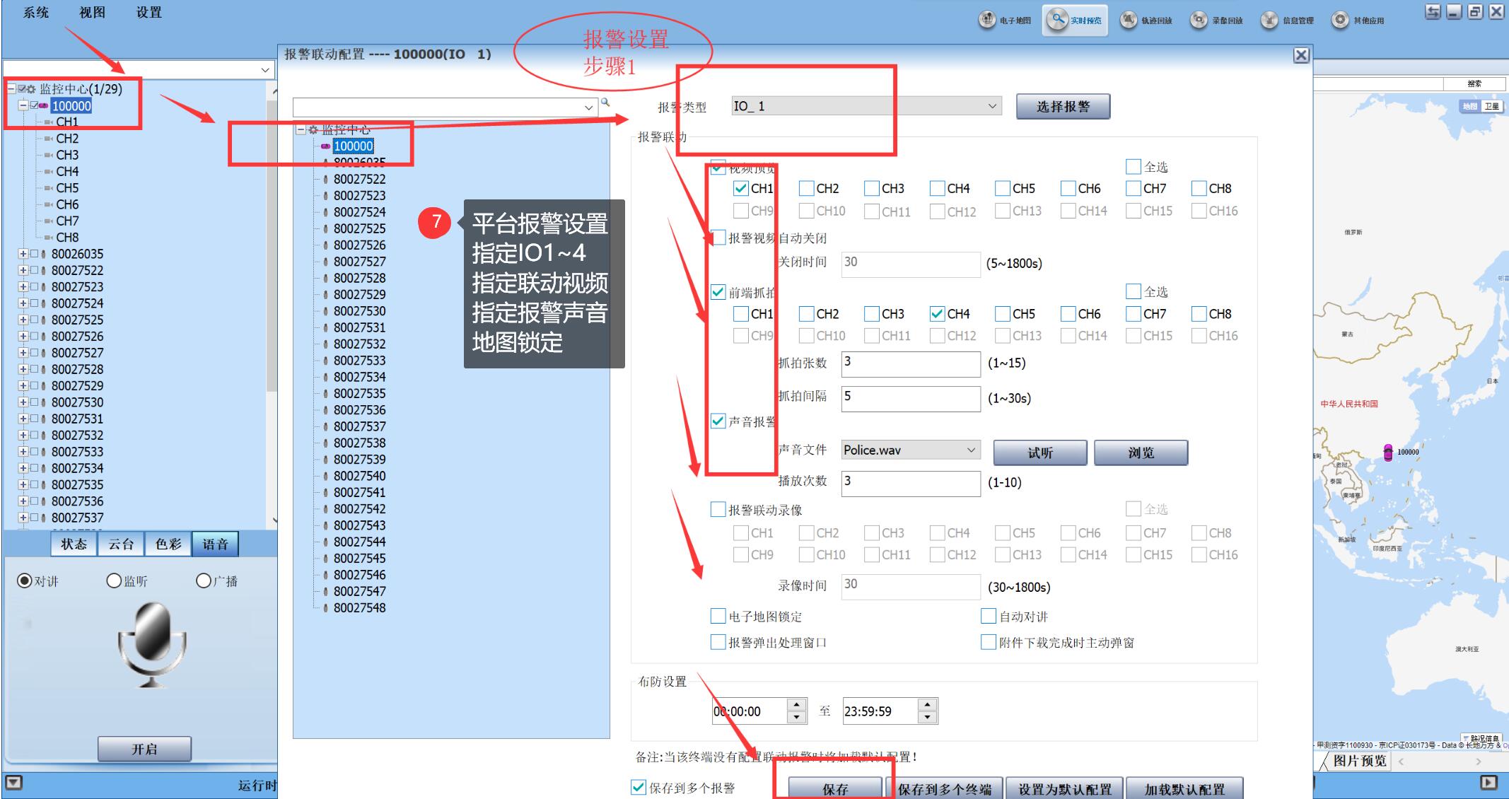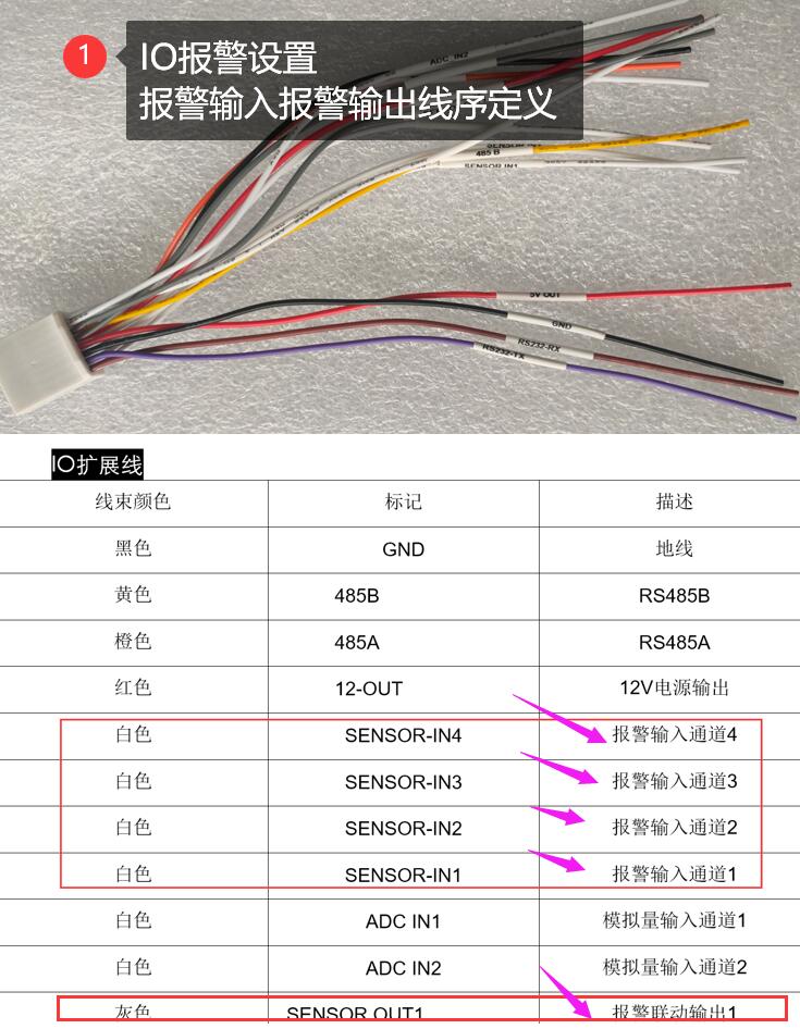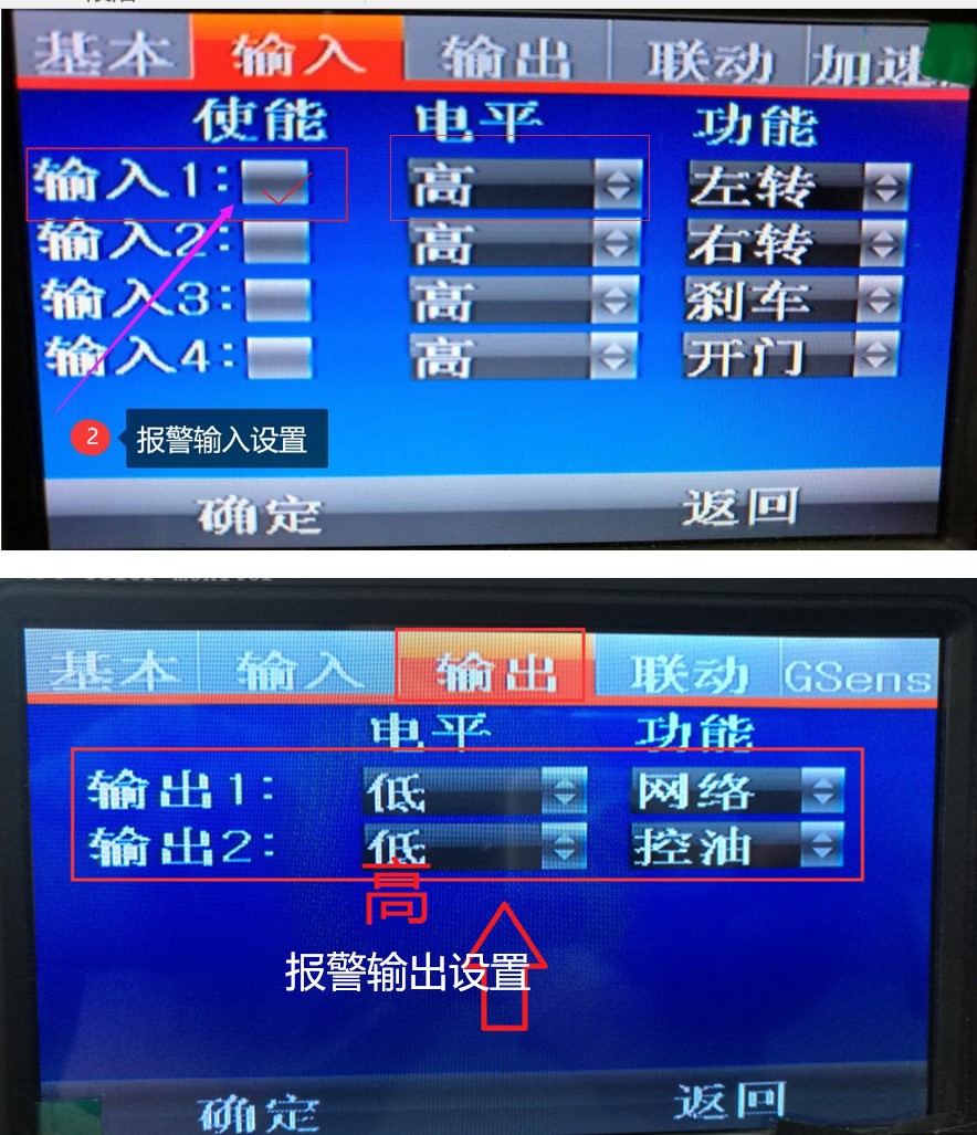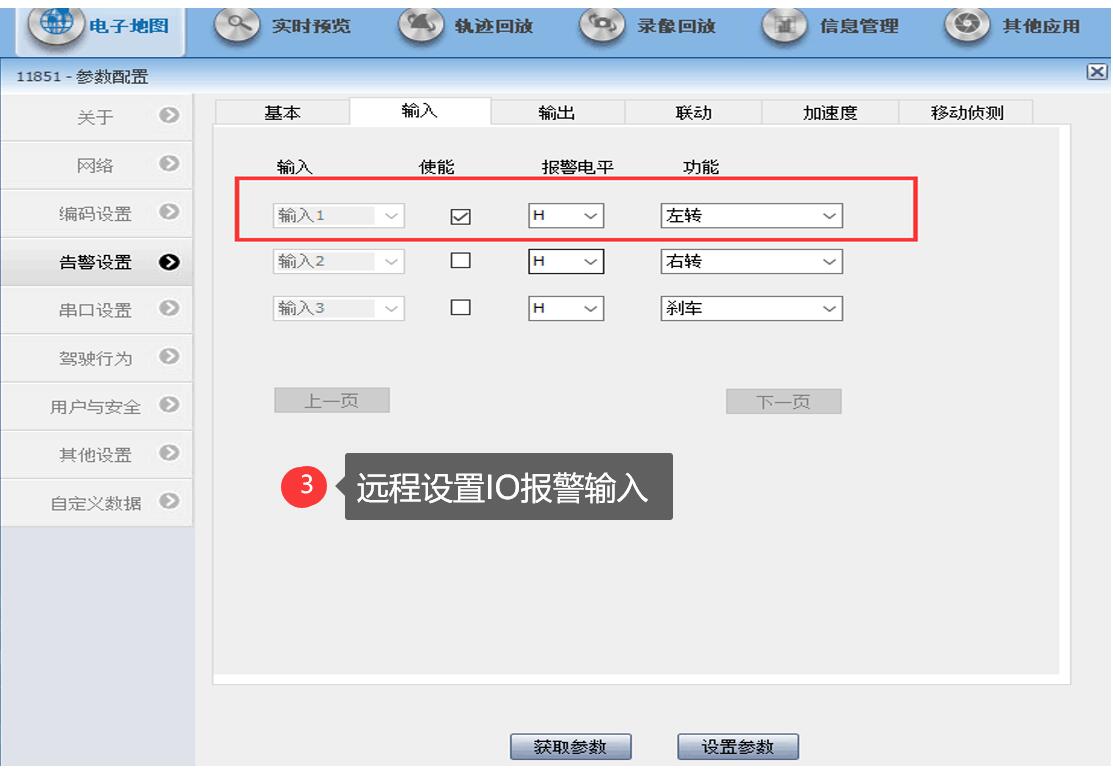IO報警輸入:指定IO1/IO2/IO3/IO4用車載錄像機的1~4路中的某路報警輸入,電平設置為“高”,功能按需要任意;輸出指定報警輸出1~2兩路報警輸出,電平為“高”特別注意:現在有些設備的UI界面上沒有報警輸出的“高低電平”設置項
