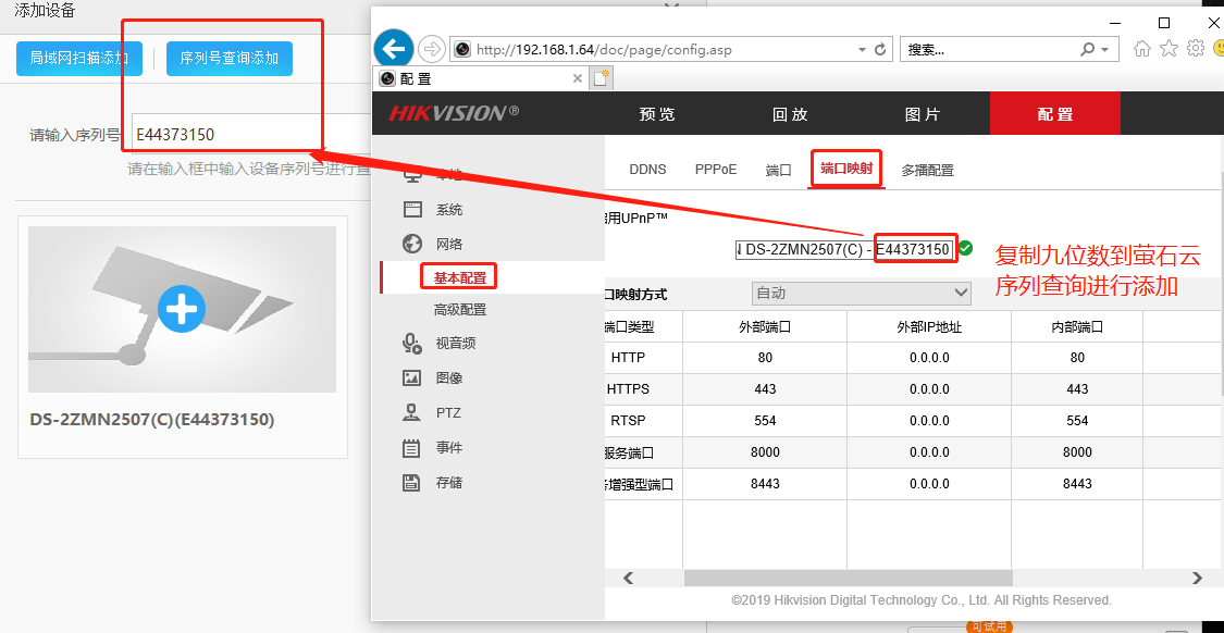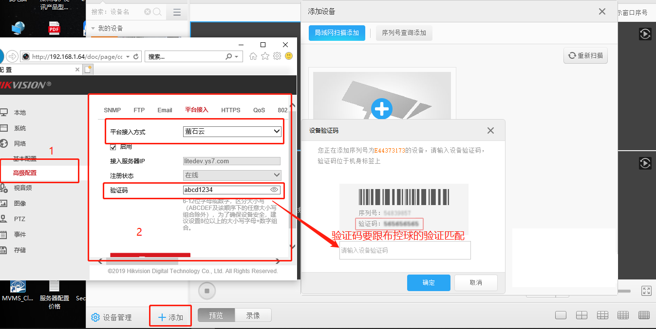 4、登錄螢石云 軟件 左下角點擊 ,設備網口連接局域網 左上角會自動掃描設備的IP進行添加 輸入設備驗證碼 點擊確定完成可查看圖像 或者用第二種方式可以再序列號查詢添加序列號 注意:序列號是九位數