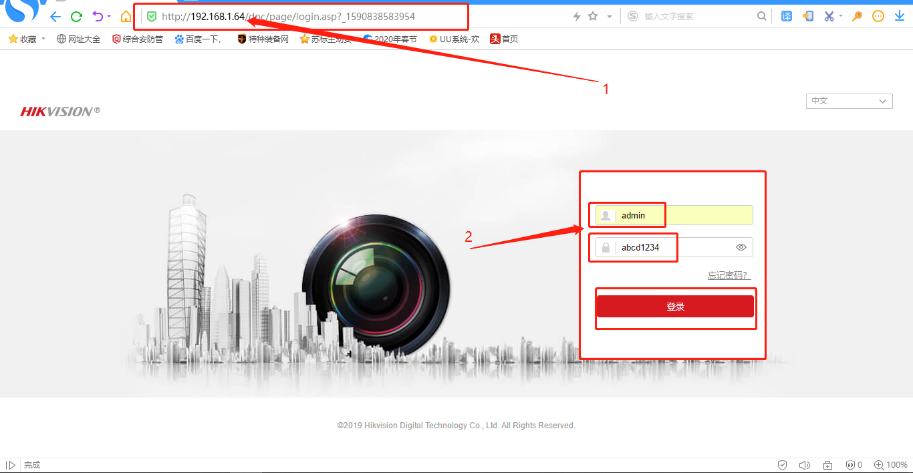 打開 瀏覽器登錄海康機芯網(wǎng)頁192.168.1.64,登錄賬號:admin 密碼:abcd1234