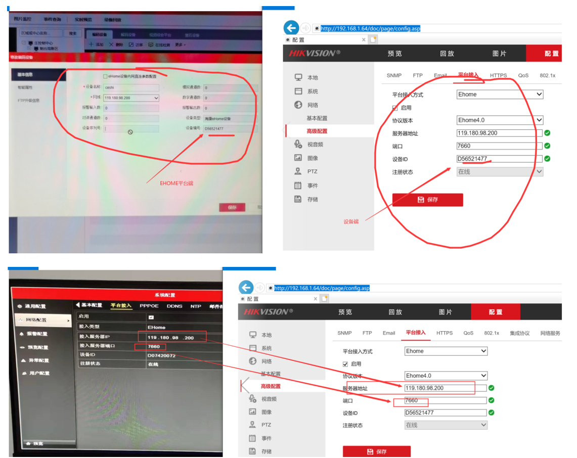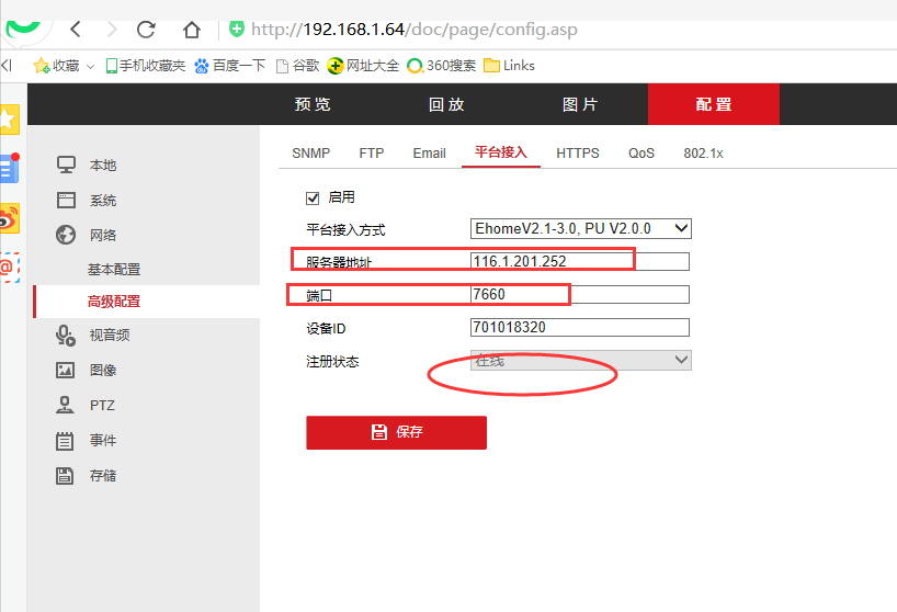 打開網(wǎng)頁 “網(wǎng)絡-高級配置-平臺接入方式”選擇Ehome,“啟用”選項打鉤“√”啟用,端口號7706,設備ID默認保存,刷新設備顯示在線即可