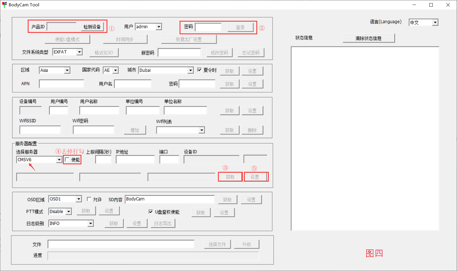 b. 用USB線連接設備到電腦,啟動上位機軟件,然后檢測并登錄(默認密碼為:888888,找到“服務器配置”項。確定服務器類型為“CMSV6”, 去掉”使能“的打勾。步驟如下圖: