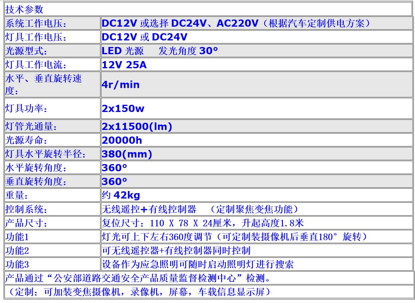 采用金屬部件,實現(xiàn)360度大面積泛光照明,2盞150W高亮度LED燈具照明達到100-300米,LED光源具備秒亮的功能,解決金屬鹵化物燈在使用時突然斷電不能立即啟動照明的技術缺陷。