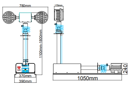 道路現(xiàn)場勘察車載照明設備升起時總高度為1.8m的車載移動應急升降照明系統(tǒng),可安裝在小型汽車和中型車的車頂,系統(tǒng)工作電壓為DC12v-24V或AC220V可選擇。