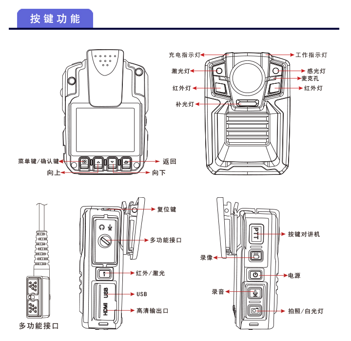 設備能顯示電池電量、充電狀態、系統時間和存儲余量等信息;開機、錄音、攝錄狀態有明顯的光指示,待機狀態指示為綠色,錄音狀態指示為橙色,攝錄狀態指示為紅色。