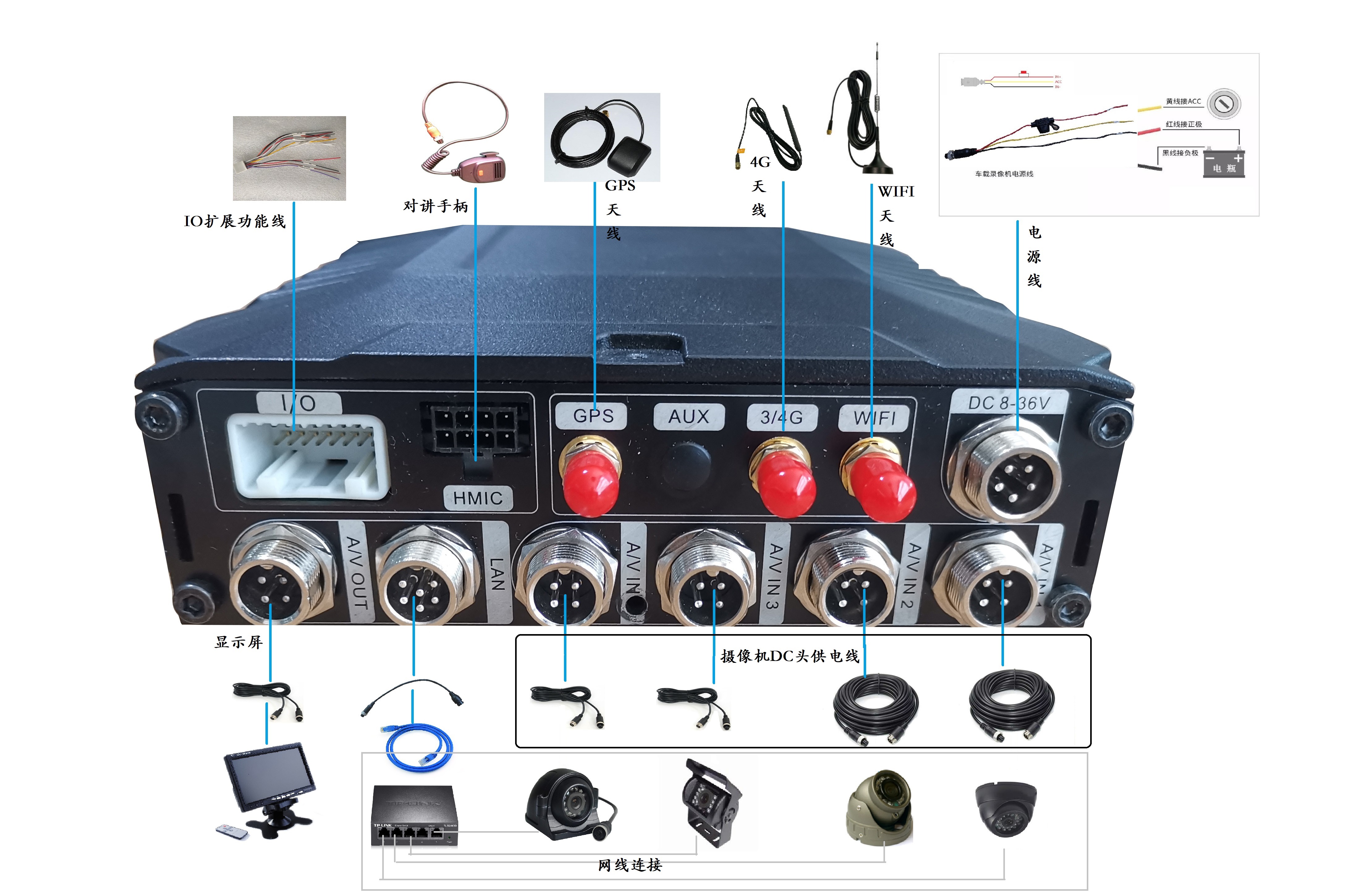 連接IPC網絡高清攝像機實現車載NVR功能,接線示意圖: