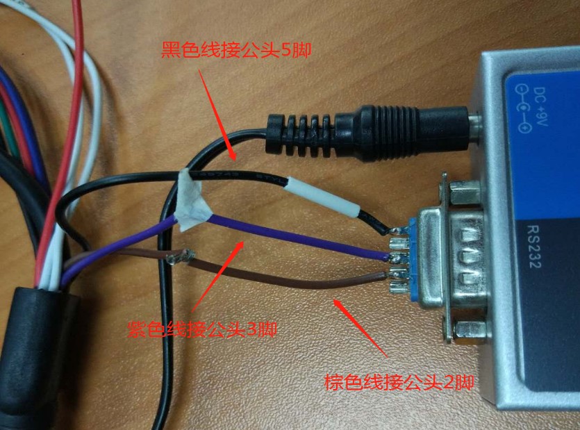下圖為RS485轉RS232信號轉換器的另一端接M32設備串口1(注意轉換器接M32一端為DB9,9針分別為2腳、3腳、5腳)。紫色線為TX,棕色線為RX,黑色線接地。除下圖所示外,該轉換器還需要接9vDC。