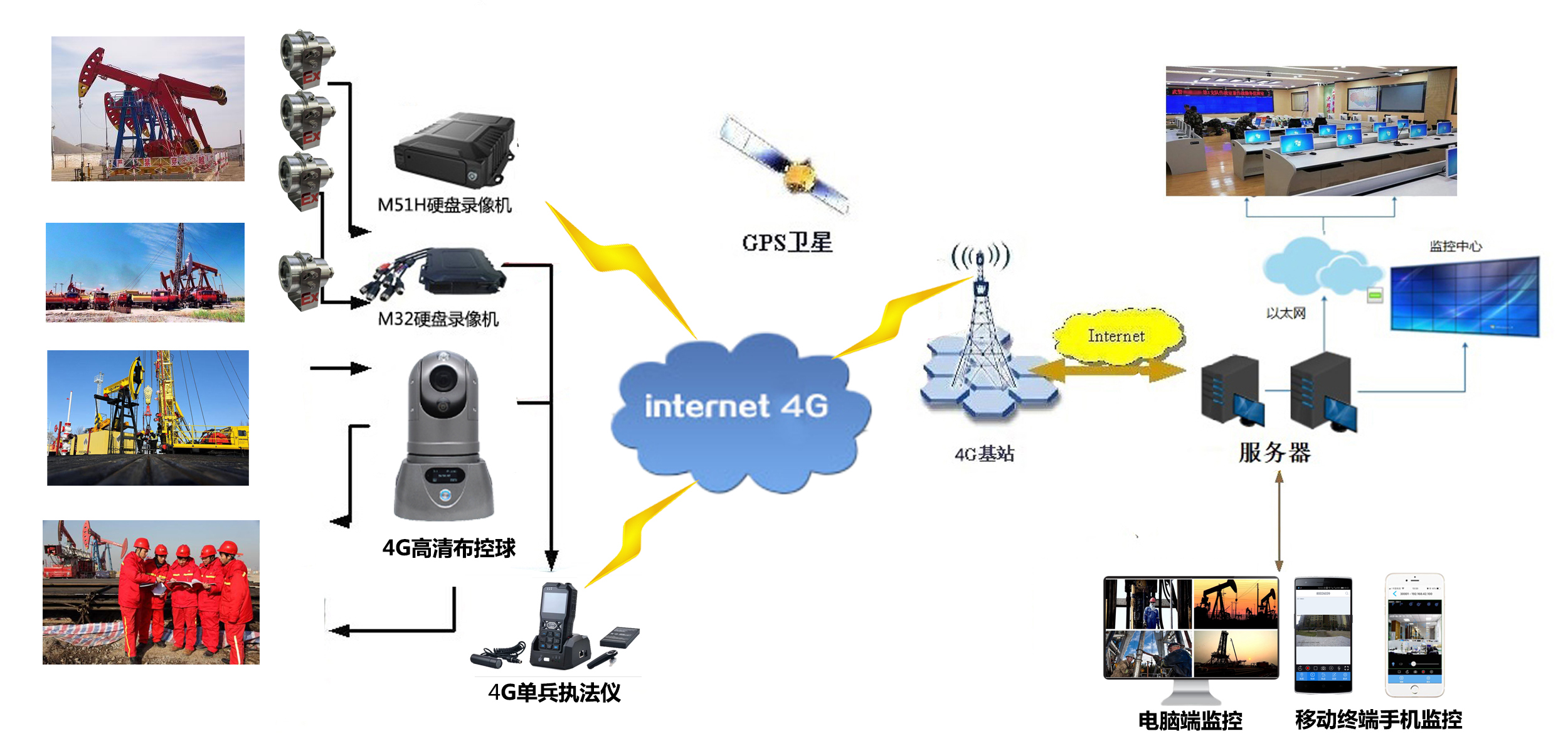 油田防爆移動式布控球,,防爆布控球,油氣布控球,油田4G可視化安全生產管控系統由三部分組成:前端圖像采集系統(含4G布控球、4G單兵、油井固定點4G監控)、4G無線傳輸系統、后臺監控管理指揮系統。專門針對油井所在地區的地理特點,結合當地的地理環境而推出的一套完整的安全綜合治理“油田4G可視化安全生產管控系統”解決方案。